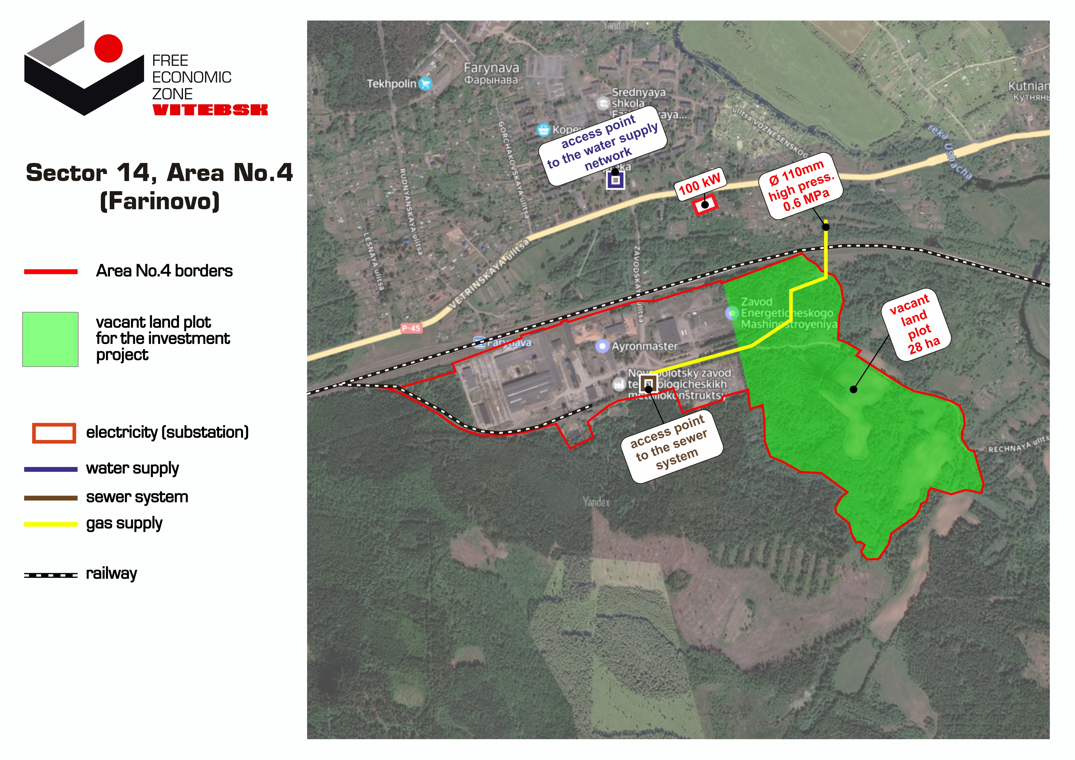 Electricity supplyThe available capacity of 100 kW when connecting to substation "Farinovo" 100/10 (higher capacities require the reconstruction of the substation "Farinovo" (owned by Vitebskenergo, RUE) - replacement of transformers)